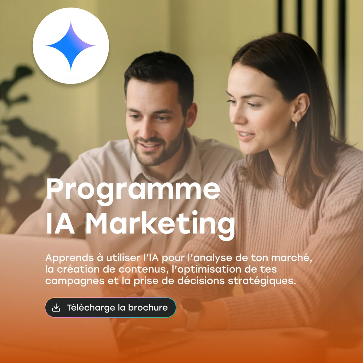 Un parcours complet composé de 13 modules pour comprendre l’IA, l’appliquer dans ton domaine et pratiquer sur tes propres cas pratiques marketing adaptés à ton métier.